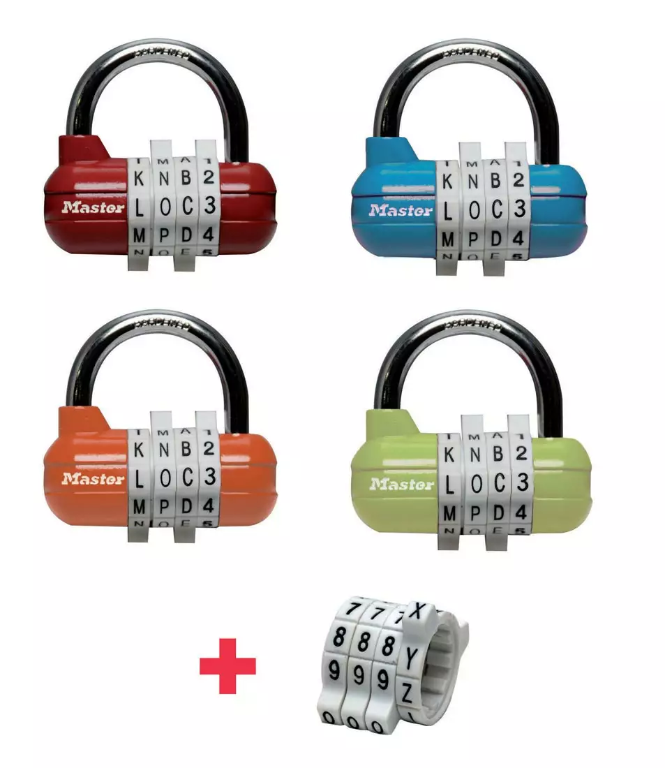 Värikäs numerolukko vaihdettavalla nelinumeroisella koodilla. Lukossa 64mm leveä metallirunko sekä 7mm paksu karkaistu terässanka. Myydään neljän kappaleen erissä. Pakkaus sisältää neljä väriä; punainen, sininen, vihreä, oranssi.