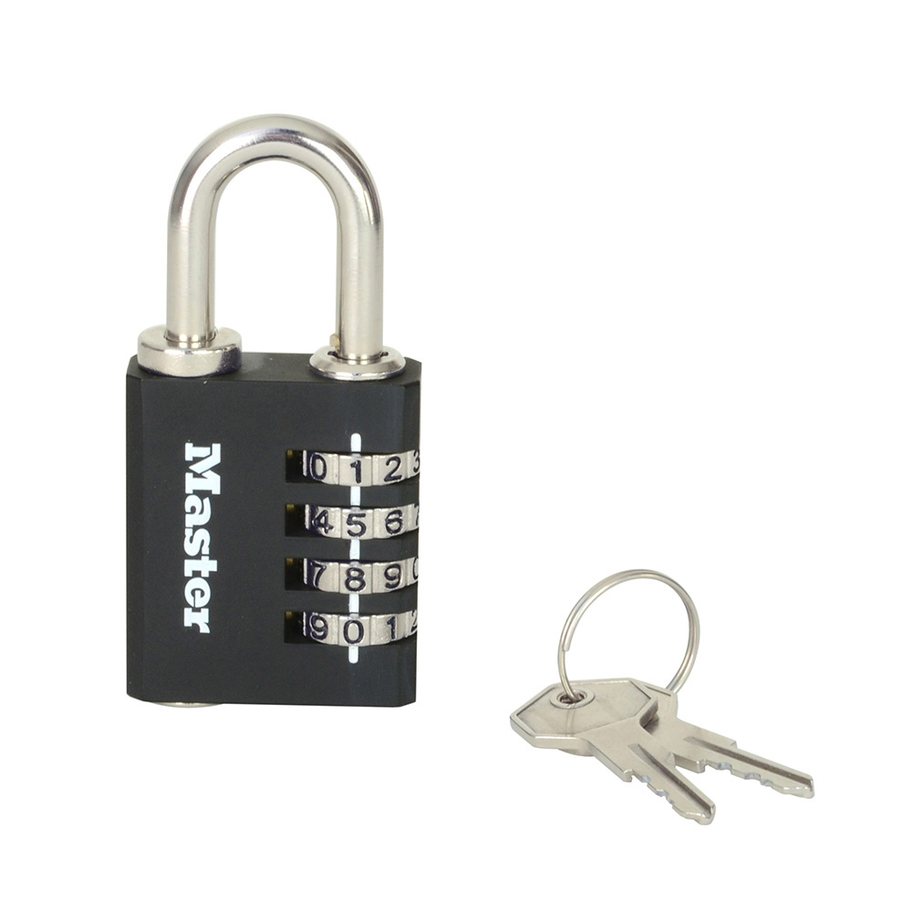 Numerolukko. Nelinumeroisella koodilla toimiva riippulukko. Lukossa on alumiinen runko ja terässanka. Lukossa on nelinumeroinen, vaihdettava numerosarja. Soveltuu mm. puku- ja säilytyskaappien sekä porttien lukitsemiseen. Lukkoon kuuluu kaksi (2) kappaletta Master-avaimia, joilla lukko voidaan avata ja/tai numerokoodi nollata, mikäli koodi on unohtunut.