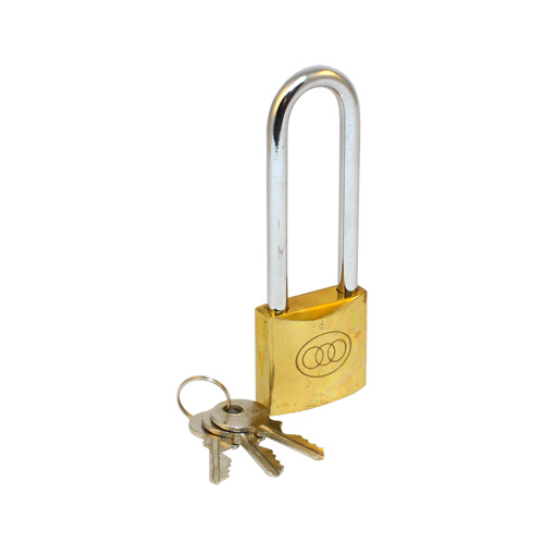 Riippulukko . Pitkäsankainen messinki riippulukko vajojen, porttien ja varastojen lukitsemiseen.