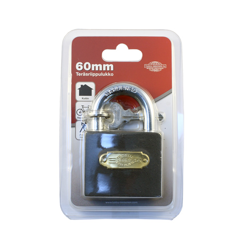 Riippulukko teräskuorella. Jykevä perusriippulukko teräskuorella ja karkaistulla terässangalla, lukkopesä on messinkiä. Riippulukko soveltuu hyvin pukukaappien, häkkivarastojen ja vajojen lukitsemiseen. Lukon mukana kolme kappaletta avaimia. Tuotetiedot: