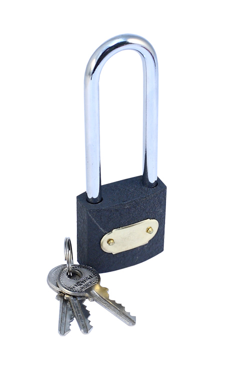 Riippulukko pitkällä sangalla . Karkaistulla pitkällä terässangalla sekä teräksisellä rungolla varustettu riippulukko.