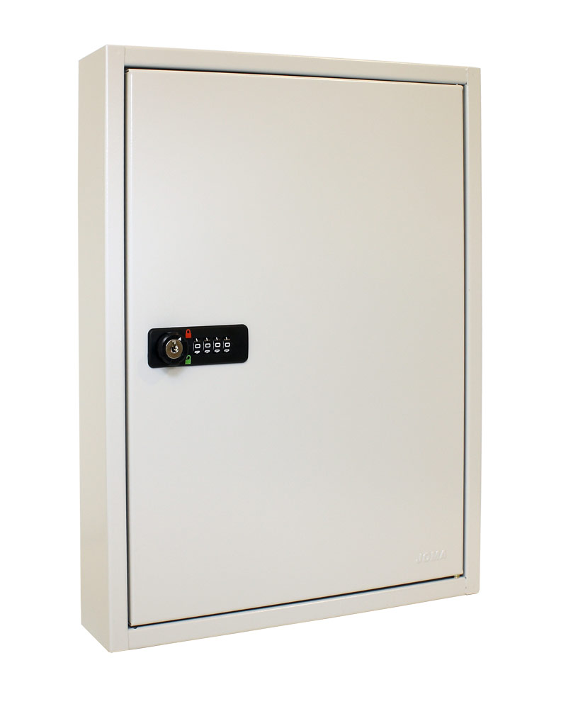 105-paikkainen avainkaappi. Joman Profesional-sarjan vaalean harmaa avainkaappi numerolukolla. Kaapissa on siirrettävät koukkurivit etu-ja takaseinässä. Avainkaapissa on valmiiksi asennettuna nelinumeroinen, mekaaninen koodilukko. Numerokoodi voidaan vaihtaa helposti.