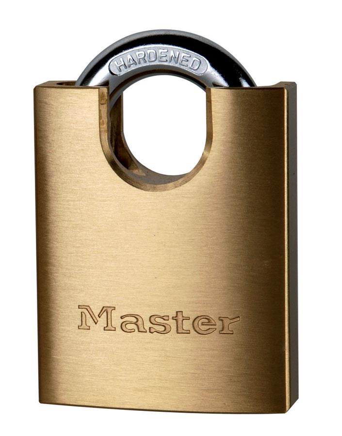 Jykevä 50mm leveä messinkiriippulukko suojatulla sangalla.