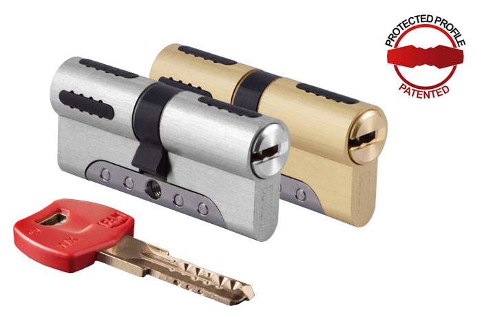 Kaksipuolinen messinkinen sylinterilukko patentoidulla avainprofiililla.