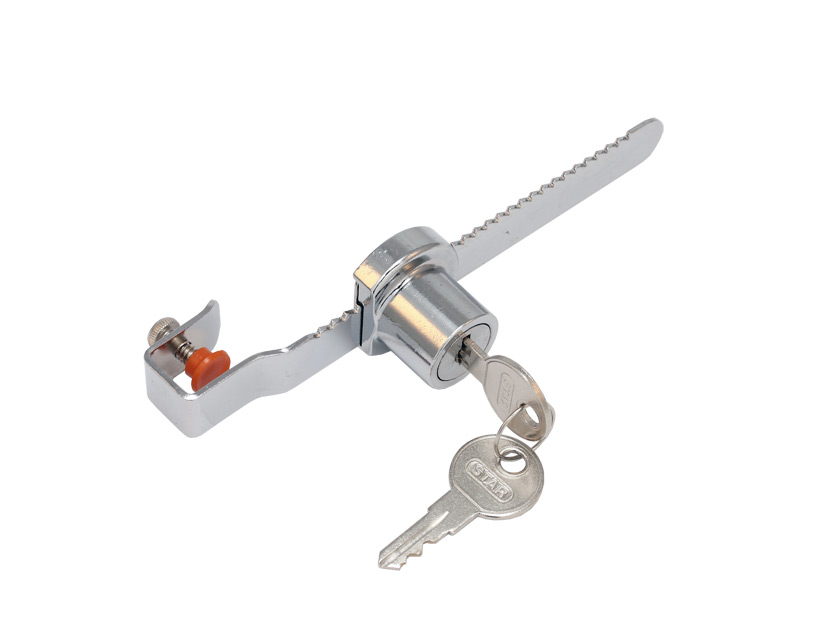 Liukulasinlukko. Vitriinin liukulasiin kiinnitettävä lukko.