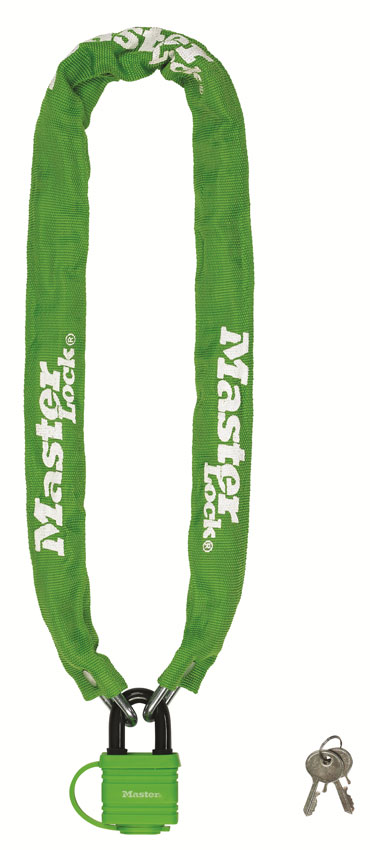 Lukituskettinki ja vesitiivisriippulukko. Teräksisen lukituskettingin päällä värikäs nailonsukka. Pakkauksessa mukana säänkestävä riippulukko. Värikäs muovikuori suojaa riippulukkoa sääoloilta. Lukkopesän päällä sääsuoja.