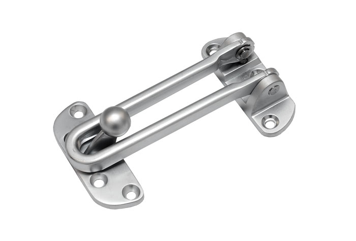 Varmuussalpa. Satiinikromattu varmuussalpa / ovirauta. Asennetaan ulospäin aukeavaan oveen.