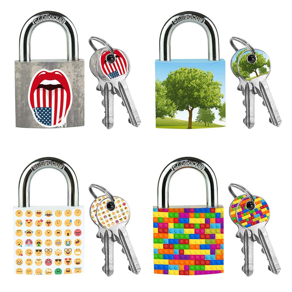 Riippulukko värikkäällä kuvioinnilla. 30mm leveä metallirunko ja 5mm paksu karkaistu terässanka tarjoavat toimivan vaihtoehdon pukukaappien ja lokerikkojen lukitsemiseen.