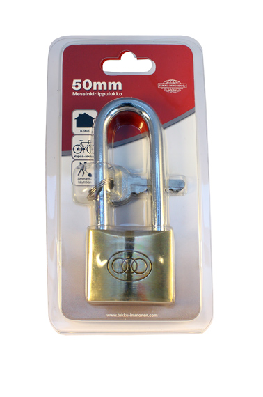 Riippulukko. Messinkinen, pitkäsankainen riippulukko. Lukossa kaksoislukittuva karkaistu terässanka. Lukkopesä on messinkiä. Riippulukko soveltuu hyvin pukukaappien, häkkivarastojen ja vajojen lukitsemiseen. Lukon mukana kolme kappaletta avaimia.