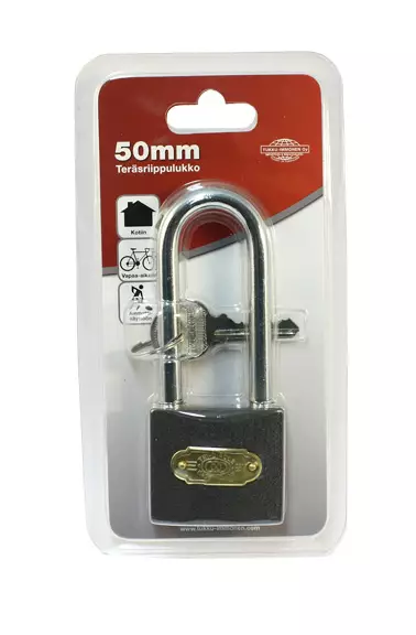 Riippulukko. Teräksinen, pitkäsankainen riippulukko. Lukossa kaksoislukittuva karkaistu terässanka. Lukkopesä on messinkiä. Riippulukko soveltuu hyvin pukukaappien, häkkivarastojen ja vajojen lukitsemiseen. Lukon mukana kolme kappaletta avaimia.
