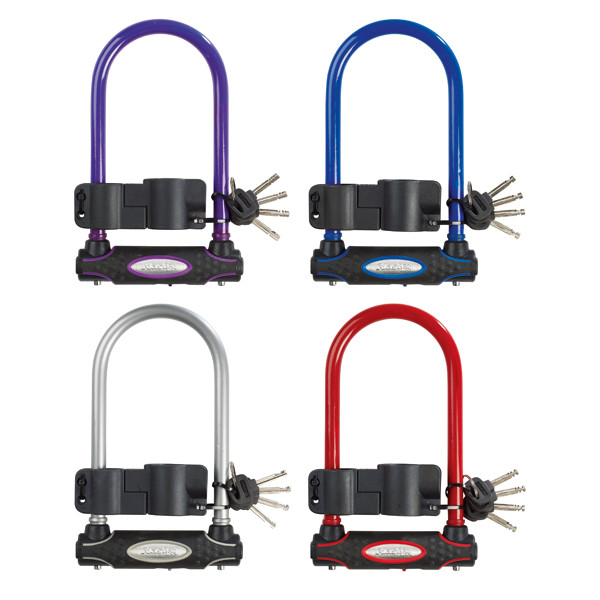 Kaarilukko kuljetustelineellä. Master Lockin kaarilukko on vakuutusyhtiöiden hyväksymä tuote. Värilajitelma: myyntierä sisältää neljää eri väriä: sininen, punainen, lila ja harmaa.