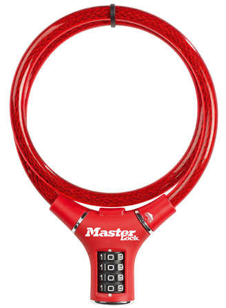 Vaijerilukko. Värikäs vaijerilukko, jossa nelinumeroinen uudelleen ohjelmoitava koodi.