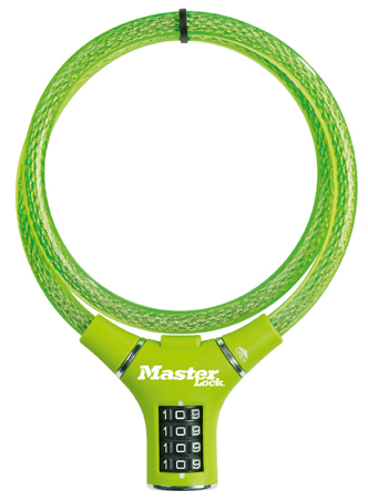 Vaijerilukko. Värikäs vaijerilukko, jossa nelinumeroinen uudelleen ohjelmoitava koodi.